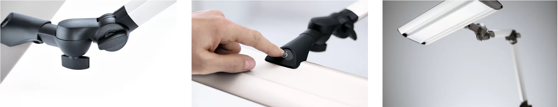 TANEO Lab 23-5000 is a premium professional lamp for a dental laboratory from the Swiss manufacturer Derungs with 80 years of experience.Thanks to the high quality of light and ergonomic handling, TANEO Lab is ideal for the workplace in the dental laboratory.Natural daylight is the best light known to us humans. We need it for our well-being and complex biological processes. It also greatly affects our vision.TANEO has ideal LED color temperature and color rendering properties for optimal color display and contrast. A unique moving and balanced boom with a large radius of action allows you to individually adjust the lamp for maximum comfort. With durable aluminum, high-quality plastic and maintenance-free LEDs, this light is durable and reliable. |