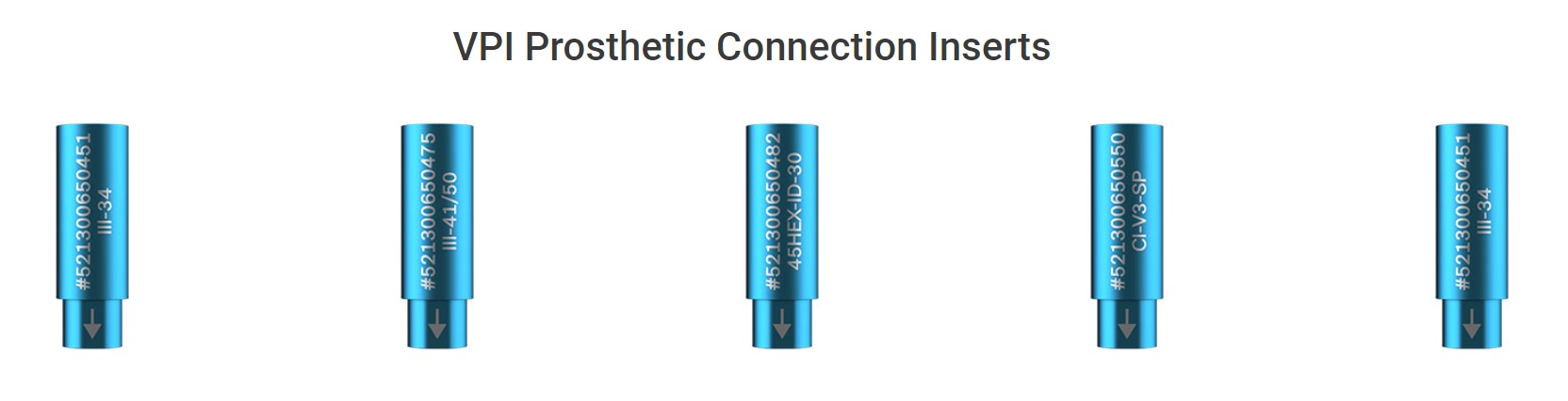 Вставка для протезного соединения VPI — это блок инновационного дизайна, который повторяет протезное соединение и платформу данного имплантата. Инновационный внешний дизайн позволяет устанавливать вставку в основание формы только в одной функциональной ориентации и в стабильном положении. Инновационный внутренний дизайн вставки VPI позволяет во многих случаях использовать ее с платформами разных размеров одного и того же ортопедического соединения. Каждая вставка поставляется с крепежным винтом, который обеспечивает ее безопасное соединение с формой. На внешней поверхности вставки имеется номер артикула и стрелка, напечатанная лазером. Доступно множество различных вставок VPI для удовлетворения клинических потребностей. Пожалуйста, обратитесь к таблице совместимости вставок для протезирования VPI, чтобы определить ту, которая соответствует вашим потребностям.