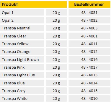 The transparent and opal materials are used for individual layering, especially in the incisal area. The opalescent elements incorporated in the base material ensure natural light-optical effects of the fired ceramic.