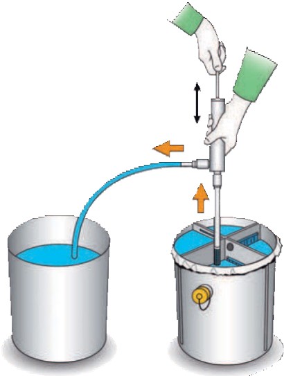 Remove the cover of the plaster separator. Submerge the pumping tube into the residual water and hang the flexible hose into a separate container. The up and down movement of the pump lever easily and effectively drains the water through the pump, via the hose, to the separate container. The plaster is disposed of in the usual manner.