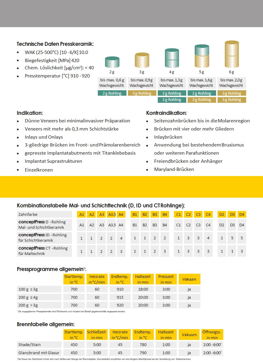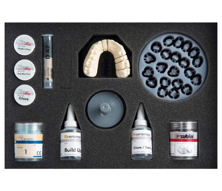 ConceptPress Training Kit - включает в себя: гипсовую модель; отфрезерованный восковый диск Ø 98 мм, 5 таблеток литий-дисиликатной керамики conceptPress, краски conceptArt, глазурь и жидкость для глазури, эмаль DC Ceram™ 9.2 Enamel; жидкость для замешивания кераміки; основание для силиконовой формы под. 13 мм таблетку; комплект одноразових плунжеров (4шт).