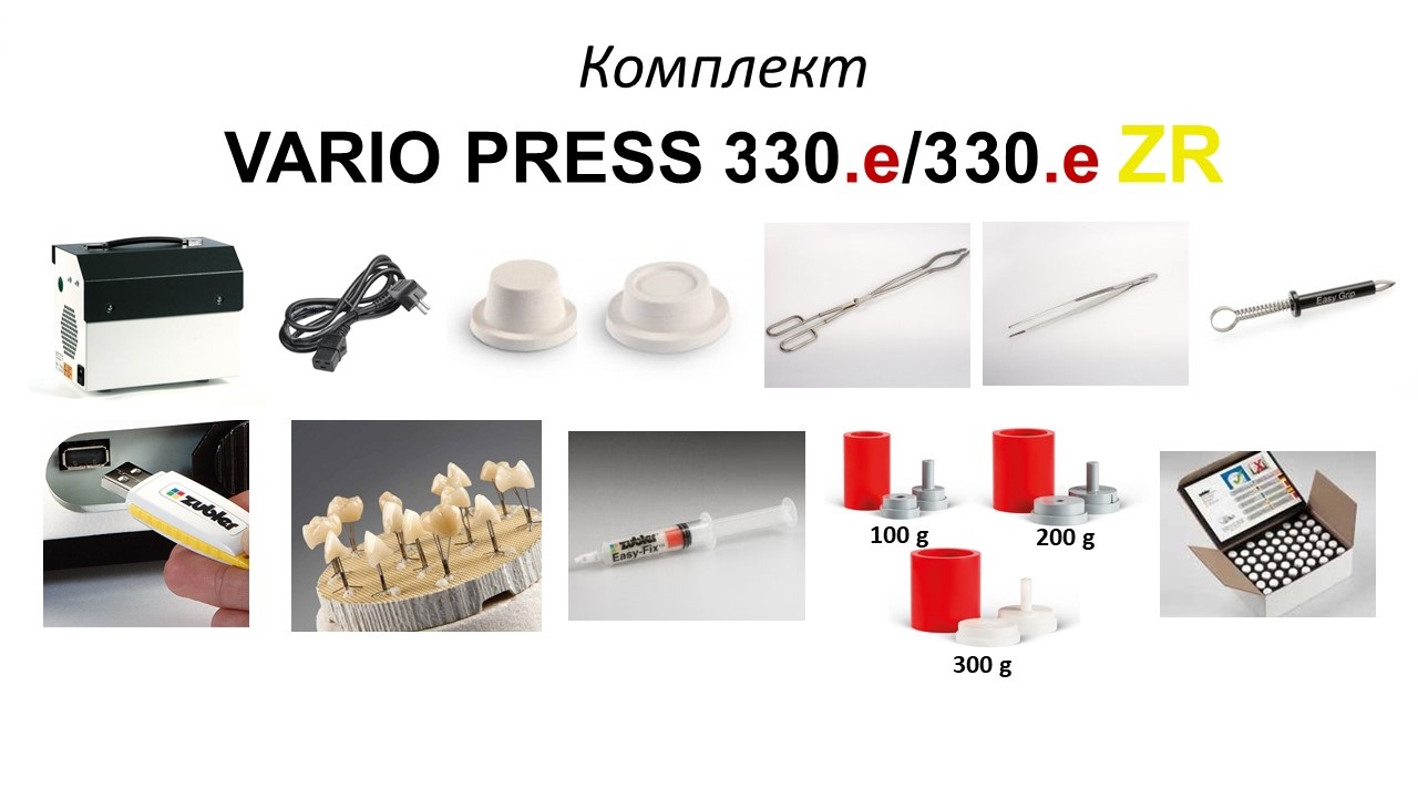 Безмасляний вакуумний насос P3 Zubler = 1 шт, столик керамічний для обжигу = 1 шт, столик керамічний для прессу = 1шт, муфельні щипці для опок = 1 шт, професійний пінцет Zubler = 1 шт, пінцет для коронок і мостів Microstar Easy-Grip = 1 шт, сотовий трегер керамічний = 1 шт, силіконова форма для пресс опок (100 гр, 200 гр, 300 гр) = 3 шт, упаковка плунжерів для пресування 13 мм = 1 шт, жидкий триггер для фіксації коронок = 1 шт, флеш карта (накопичувач) Zubler = 1 шт, кабелі для підключення = 2 шт, редуктор повітряний = 1 шт.