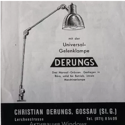 Автором імені та засновником сьогоднішньої компанії Derungs Licht AG є Крістіан Дерунгс, який розпочав виробництво універсальних ламп у 1939 році в невеликій майстерні в Госсау. Його сини, Уолтер і Роланд Дерунги, перетворили сімейний бізнес на міжнародно успішну компанію.